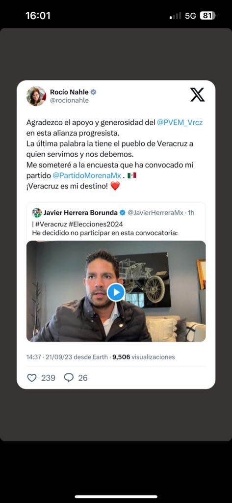 A través de un mensaje que difundió en sus redes sociales, el veracruzano hizo público el apoyo del PVEM a Rocío Nahle rumbo a la selección interna de Morena para elegir al candidato de ese partido rumbo a las elecciones del 2024 por la renovación de la gubernatura de Veracruz, en donde Herrera Borunda condicionó la permanencia del PVEM en la alianza electoral con Morena y el PT en Veracruz para el próximo proceso electoral que se disputará en el estado.
