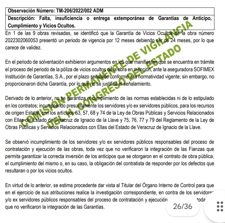 parámetros establecidos para la obtención del monto de la Garantía de Vicios Ocultos conforme a lo previsto por el artículo 68 párrafo segundo de la Ley de Obras Públicas y Servicios Relacionados con ellas del Estado de Veracruz de Ignacio de la Llave; incumpliendo presuntamente los servidores y/o ex