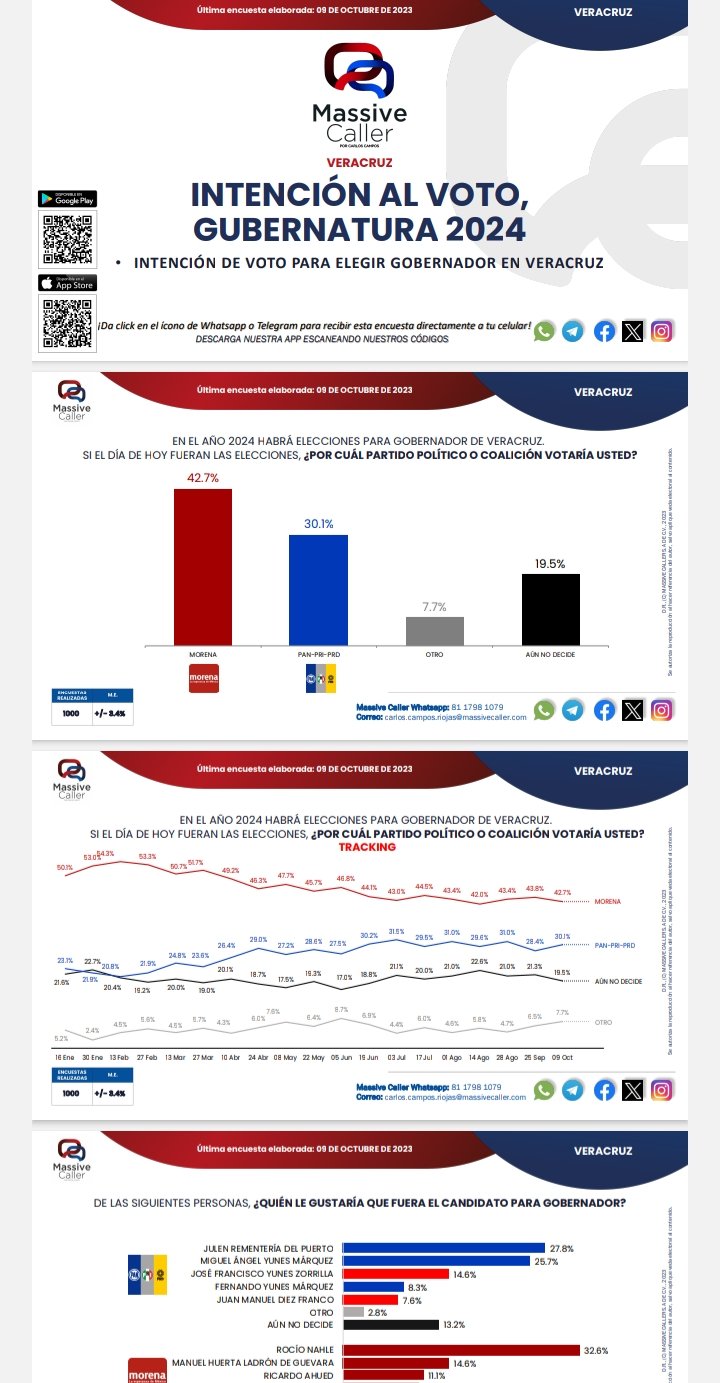 Además, Massive Caller da a conocer que si hoy fueran los comicios para la gubernatura, en promedio, Rocío Nahle García (Morena), sería puntera con 43.5 por ciento; Ricardo Ahued (Morena), arroja 40.9 por ciento; Julen Rementeria obtendría 28.1 por ciento; Miguel Ángel Yunes Márquez (PAN-PRI y PRD), 27.5 por ciento.
