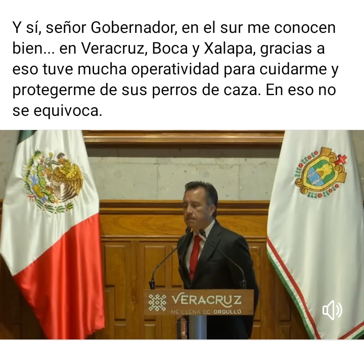 «Y sí, señor Gobernador, en el sur me conocen bien… en Veracruz, Boca y Xalapa, gracias a eso tuve mucha operatividad para cuidarme y protegerme de sus perros de caza. En eso no se equivoca», puntualizó.