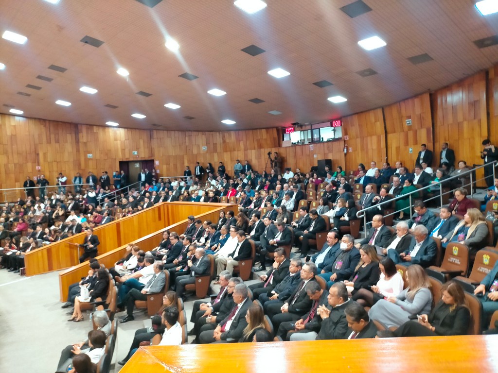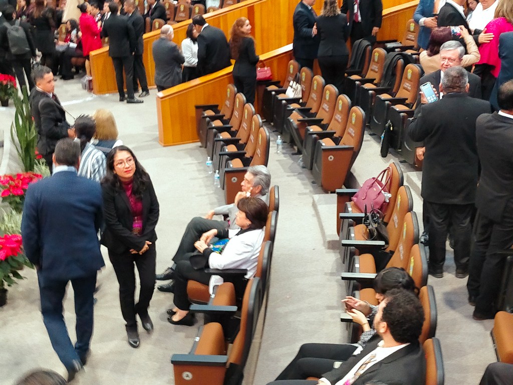 El recinto plenario repleto, al igual que el lobby del Congreso, resaltaba y contrastaba con las curules medio vacías. Porque al inicio, de lado del grupo mayoritario de MORENA, había 9 diputados y del lado de la oposición dos diputados, Ruth Callejas Roldán de Movimiento Ciudadano, y José Luis Tehuintle Xocua del PT, más tarde llegaron las diputadas del PRI, Anilu Ingram Vallines, la diputada Ariadna Guadalupe Ángeles Aguirre, el diputado Enrique Santos ahora aliado de Morena, que llegó como Fuerza por México, la diputada panista Nora Jessica Lagunes Jauregui y ya después de las 12:30 PM, llegó Citlalli Medellín del PVEM y la diputada Maribel Topete Ramírez de Movimiento Ciudadano.
