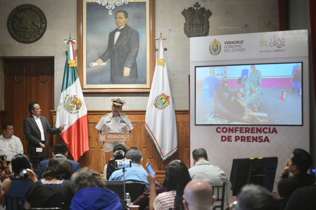 En la conferencia, el vicealmirante Pablo Gabriel Alcántara Silva, de la Tercera Región Naval en Veracruz, detalló el decomiso de 80 kilogramos de metanfetamina granulada, conocida como “cristal” y valuada en un millón de pesos por kilo, que pretendía salir por el puerto de Veracruz hacia España escondida en el interior de un engrane reductor hueco, procedente de Querétaro.
