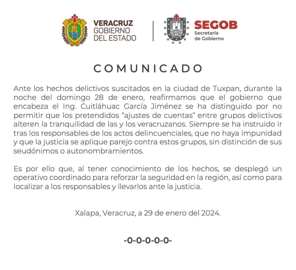 También la Secretaría de Gobierno a cargo de Carlos Juarez Gil expresó que ante los hechos ocurridos en Tuxpan el gobierno de Cuitláhuac García no permitirá los ajustes de cuentas entre bandas del crimen organizado.