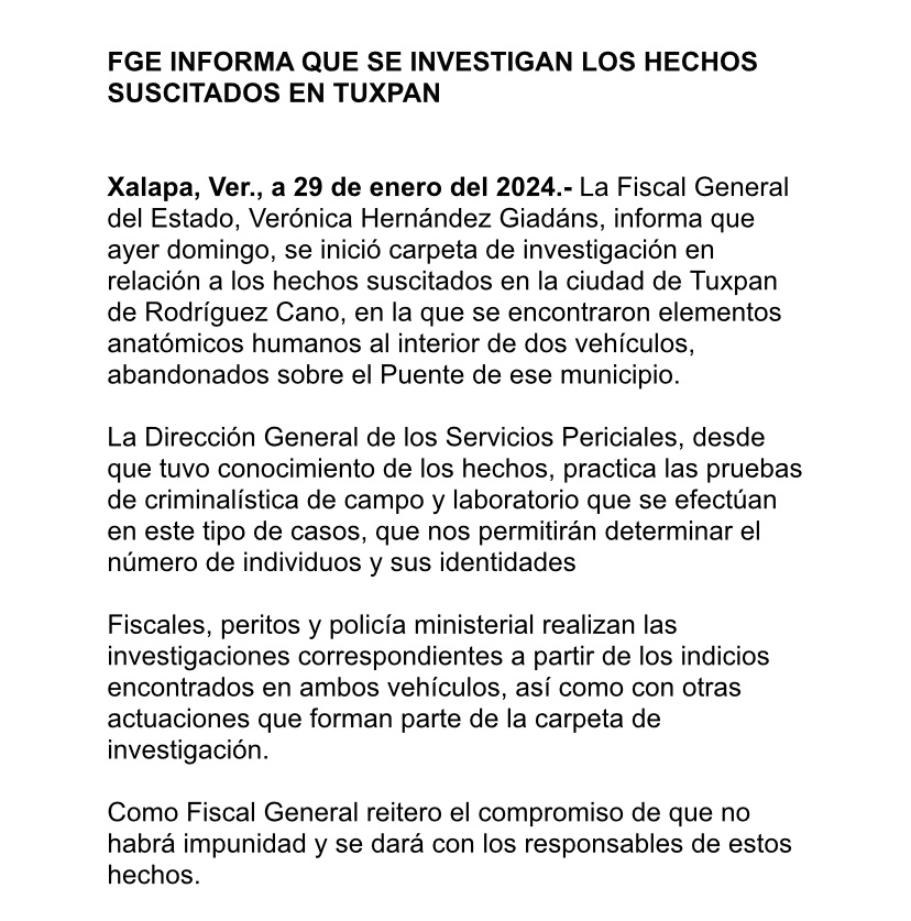 La Fiscal General del Estado, Verónica Hernández Giadáns, informa que ayer domingo, se inició carpeta de investigación en relación a los hechos suscitados en la ciudad de Tuxpan de Rodríguez Cano, en la que se encontraron elementos anatómicos humanos al interior de dos vehículos, abandonados sobre el Puente de ese municipio.