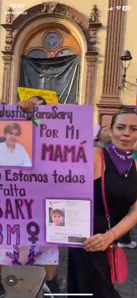 También estaban familiares de Fátima Cristal Gonzalez Platas, lleva más de un año desaparecida, su tía Guadalupe Rubí Romero de Villa Aldama, la sigue buscando. Pidió a la Fiscalía “que se toque el corazón y apure a la búsqueda”. Le da alegría casos como el de “Bibian”, estudiante de la Antonio María de Rivera, que la Fiscalía buscó y encontró de forma rápida. Pide la misma atención para su sobrina. También que la gente no juzgue. Hoy la tía de Fátima estuvo presente en la marcha del 8M.