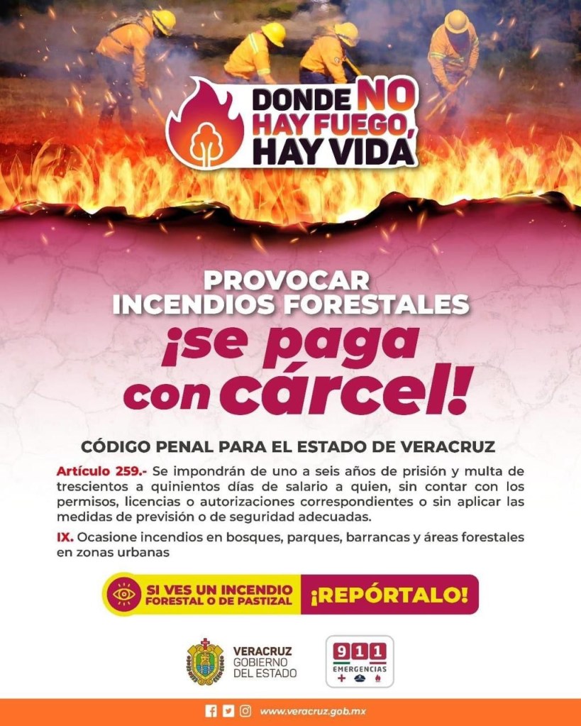 En un comunicado el gobierno del estado, recordó que en Veracruz, se sanciona con uno y hasta seis años de prisión y multas de hasta 75 mil pesos a aquellas personas o persona que cause un incendio forestal.