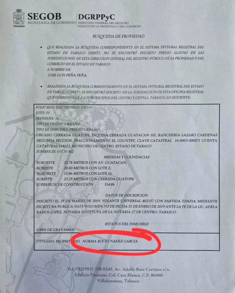 La mansión a donde habita la señora @rocionahle en el fraccionamiento “El Dorado” es propiedad de su sobrina Maribel Hoyos Peña como lo acredité con la escritura Núm. 4053, libro 75, de la Notaría Pública Núm. 53 por un monto de $4,970,000.00 pesos, costo del terreno únicamente.