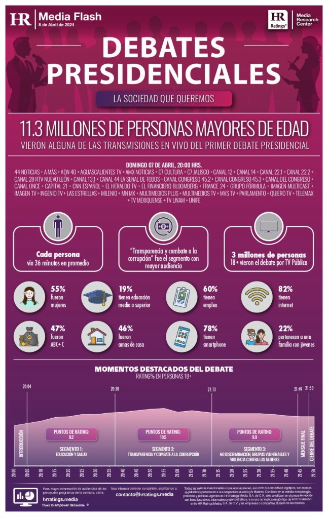 El Primer Debate Presidencial 2024, organizado por el Instituto Nacional Electoral (INE), fue visto por 11.8 millones de personas mayores de 18 años en televisión, de acuerdo con la medición de la empresa HR Ratings Media, informaron consejerías integrantes de la Comisión Temporal de Debates, en conferencia de prensa.