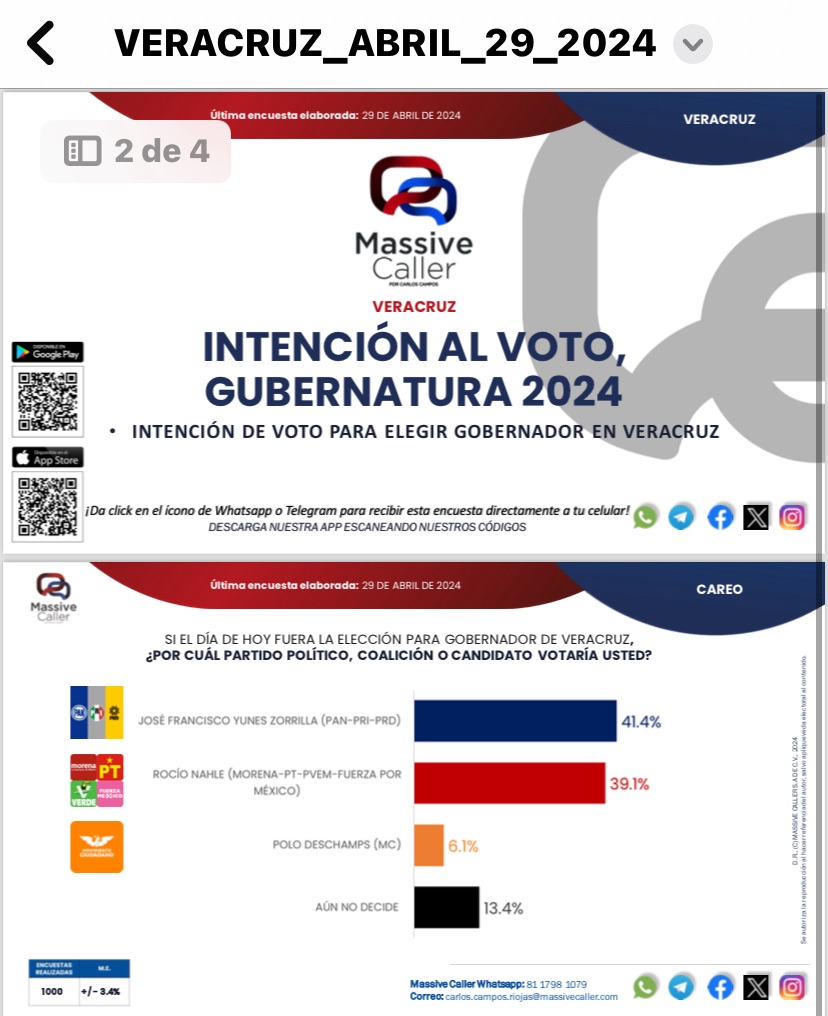 Xalapa, Veracruz, 30 de abril— De acuerdo con el último estudio de intención de voto realizado por Massive Caller el 29 de abril, Pepe Yunes ahora encabeza la carrera por la gubernatura de Veracruz con un 41.4% de la intención de voto. Rocío Nahle sigue con un 39.1%, mientras que Polo Deschamps cuenta con el 6.1%, y un 13.4% de los encuestados aún no decide su voto.