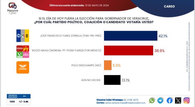 Xalapa, Veracruz, 2 de mayo.- Al concluir el primer mes de campaña electoral, los cambios en la intención de voto para la gubernatura de Veracruz son evidentes. Pepe Yunes, candidato de la coalición Fuerza y Corazón por Veracruz, que incluye a PAN, PRI y PRD, ha logrado un aumento significativo en las preferencias, posicionándose en primer lugar con el 42.1%. Por el contrario, Rocío Nahle, de la coalición Juntos Haremos Historia, integrada por MORENA, PT y el Partido Verde, ha visto cómo su apoyo se desploma hasta el 38.9% en la medición más reciente.