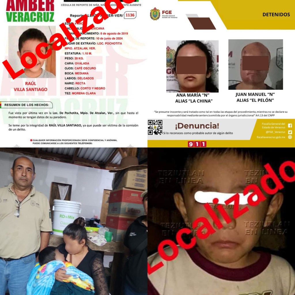 Xalapa, Veracruz, a 12 de junio de 2024.- La Fiscalía General del Estado informa que, como resultado de una efectiva labor de investigación, ayer martes, se ha logrado localizar con vida, sano y salvo, a un menor de edad de identidad resguardada, tras haber sido privado de su libertad en el municipio de Atzalan, mismo que ya ha sido entregado a sus padres.