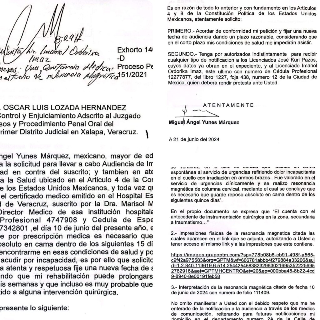 “En virtud de encontrarme en esas condiciones de salud y por tanto al no poder acudir por incapacidad, es por ello que solicito a usted de manera atenta y respetuosa fije una nueva fecha de audiencia, considerando que mi rehabilitación puede prolongarse por al menos seis semanas y que incluso es muy probable que vuelva a ser sometido a una intervención quirúrgica”, refirió.