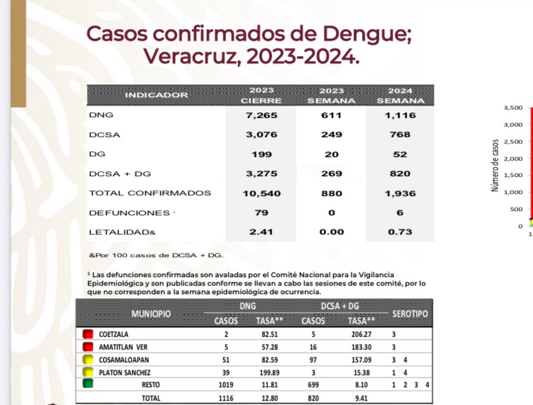 Los municipios con casos de dengue en Veracruz son; Coetzala con cinco casos, Amatitlán con 16, Cosamaloapan 97 y Platón Sánchez con 3 casos. Los casos de alarma se ubican en Cosamaloapan y Platón Sánchez. Hay 699 casos diseminados en el resto del estado, que no representan grandes cantidades porque están dispersos.