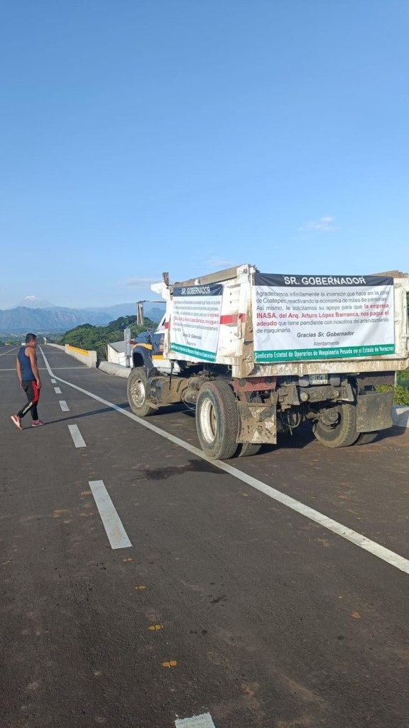 En los camiones de volteo colgaron lonas donde se lee el mensaje: “agradecemos infinitamente la inversión que hace en la zona de Coatepec, reactivando la economía de miles de personas. Asimismo, le solicitamos su apoyo para que la empresa INASA, del arquitecto Arturo López Barranca, nos pague el adeudo que tiene pendiente con nosotros del arrendamiento de maquinaria. Gracias, señor Gobernador”.