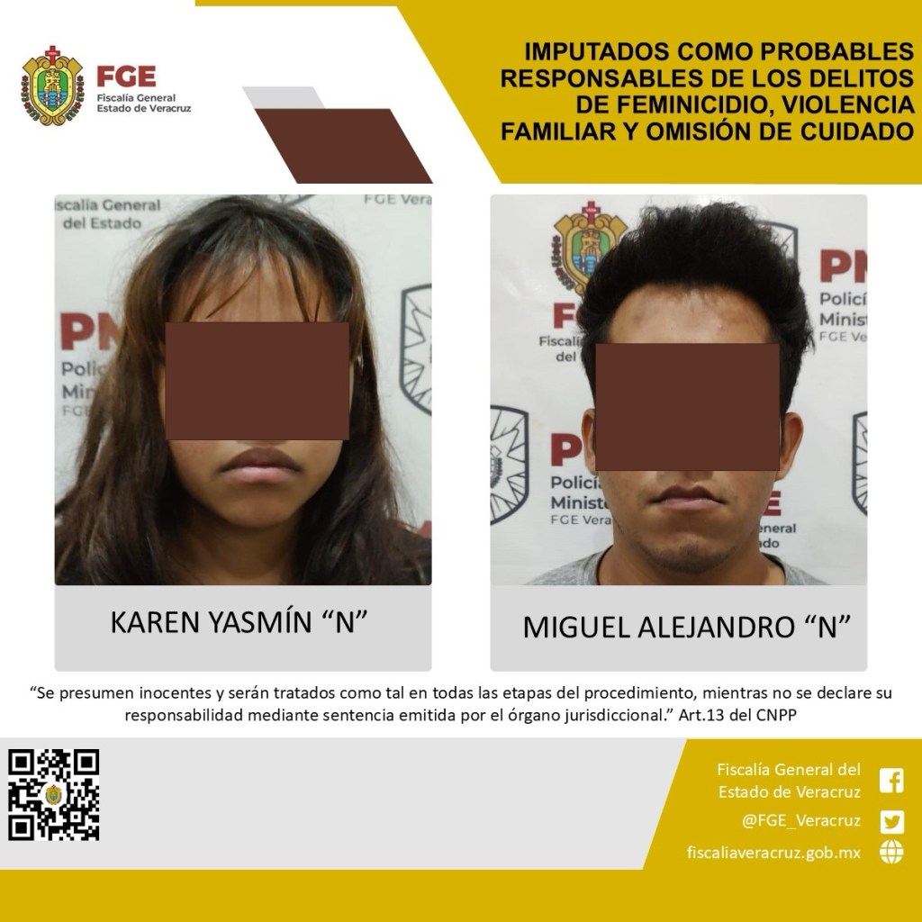 Córdoba, Ver.- La Fiscalía Especializada en delitos de violencia contra la familia, Mujeres, Niñas y Niños y Trata de Personas encontró elementos que vincularon a Miguel Alejandro “N” y Karen Yasmín “N” en cargos de feminicidio, violencia familiar y omisión de cuidado a su hijastra e hija de cuatro años de edad.