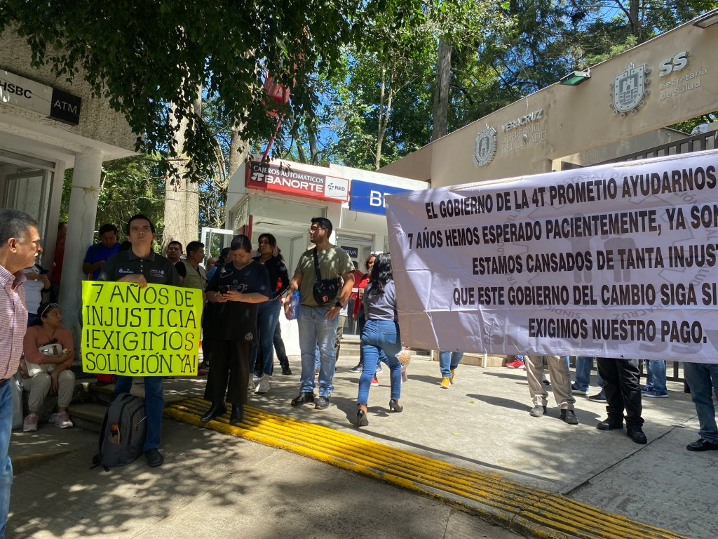 Un grupo de aproximadamente 50 ex trabajadores del extinto Seguro Popular realizaron un plantón frente a las oficinas centrales de los Servicios de Salud de Veracruz (SESVER) para exigir el pago de laudos pendientes.