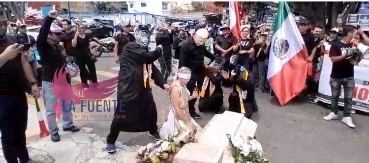 La «Justicia» estaba representada por una figura vendada y encadenada, flanqueada por un burro y un personaje con la máscara del presidente Andrés Manuel López Obrador.