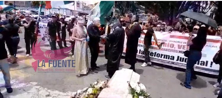 Con una imagen de un ataúd y la justicia postrada, los trabajadores del Poder Judicial Federal marcharon en protesta contra la Reforma Judicial, en la avenida Lázaro Cárdenas, frente al Congreso del Estado de Veracruz.