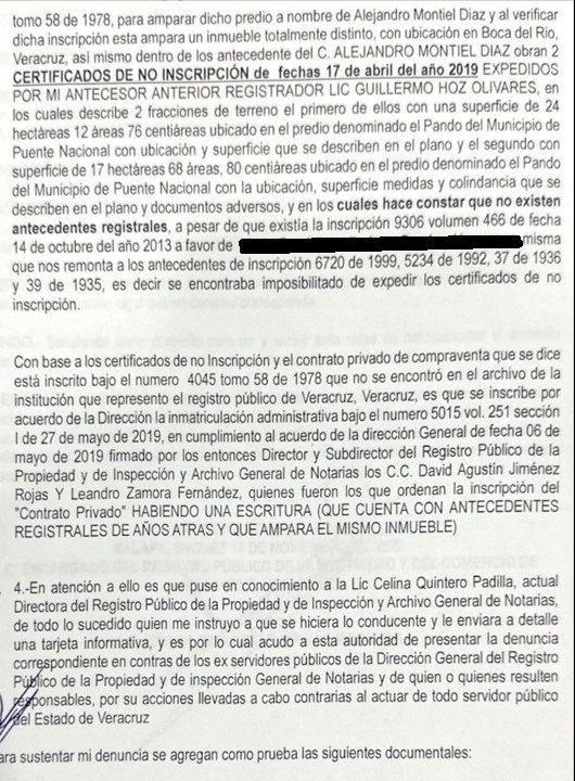 Según la denuncia, Leandro «N» y David J.R., actual presidente del Instituto Veracruzano de Acceso a la Información (IVAI), ordenaron la inscripción de contratos privados para adjudicar propiedades a Alejandro Montiel Díaz, despojando a los verdaderos dueños.