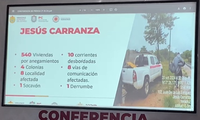 En Cosoleacaque, hay 175 viviendas con anegamientos y 3 colonias afectadas; en Jesús Carranza, 40 viviendas están anegadas, así como 4 colonias, 8 localidades afectadas, un socavón, 10 corrientes desbordadas y 8 vías de comunicación dañadas, además de un derrumbe.