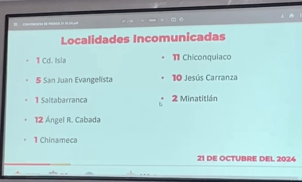 La secretaria contabilizó 43 comunidades incomunicadas, entre ellas Ciudad Isla, Chinameca, Saltabarranca y dos en Minatitlán; cinco en San Juan Evangelista; 12 en Ángel R. Cabada; 11 en Chiconquiaco y 10 en Jesús Carranza.