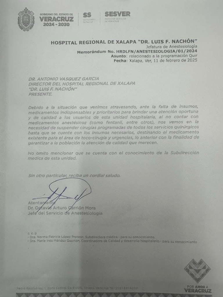 A través del memorándum número HRDLFN/ANESTESIOLOGIA/01/2024 de fecha 11 de febrero de 2015, signado por el doctor Octavio Arturo Carrión Mora, jefe de Servicios de Anestesiología y dirigido al director del citado nosocomio, doctor Antonio Vásquez García, le da cuenta de este desabasto y de la medida aplicada.