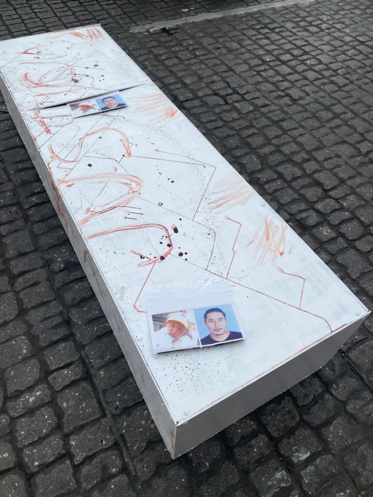 Con un performance de un féretro ensangrentado y con las fotos de Dorian y su hijo (bebé al momento de su muerte), cerraron la calle Enríquez y exigieron justicia tras la marcha.