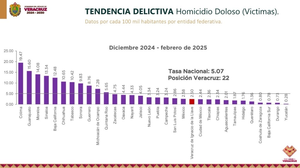 Además, Veracruz se ubica en el lugar 25 en cuanto a delitos totales por cada 100 mil habitantes.