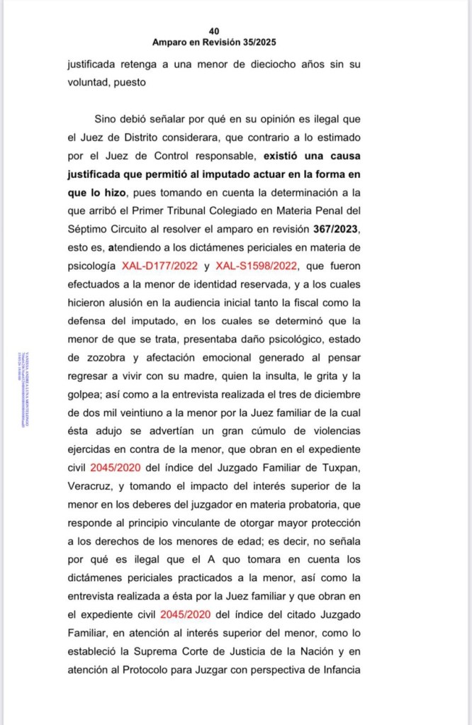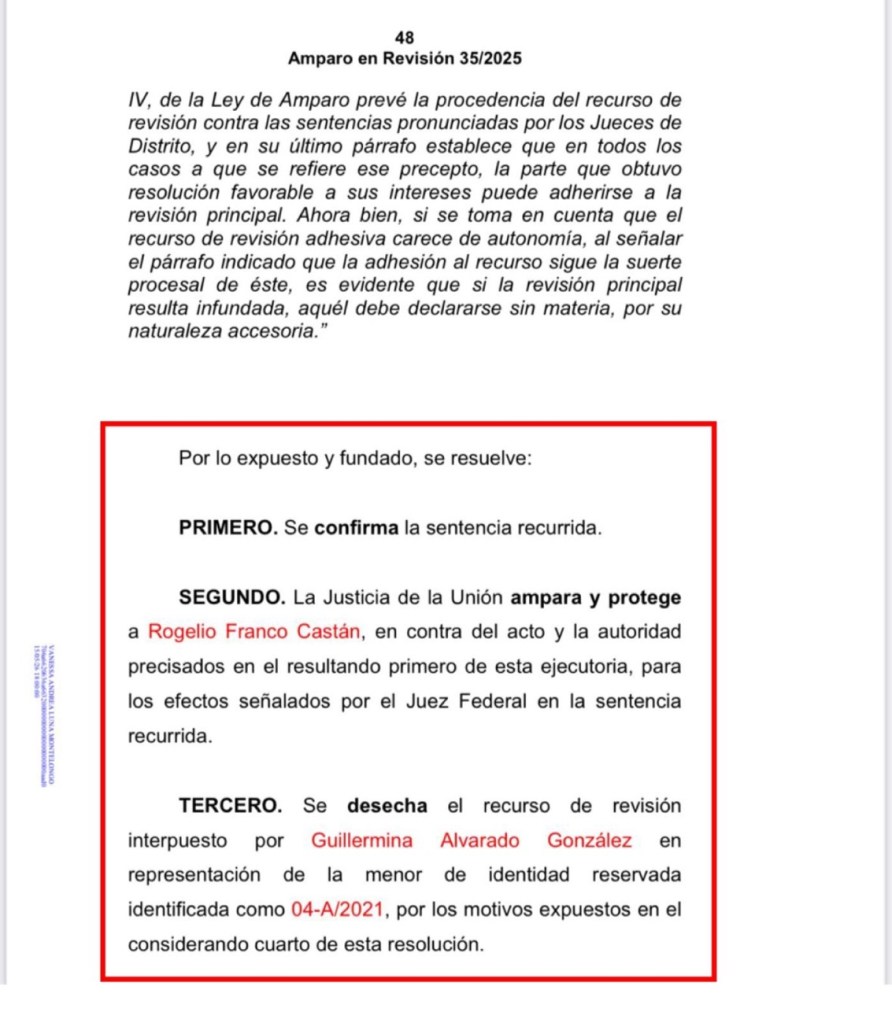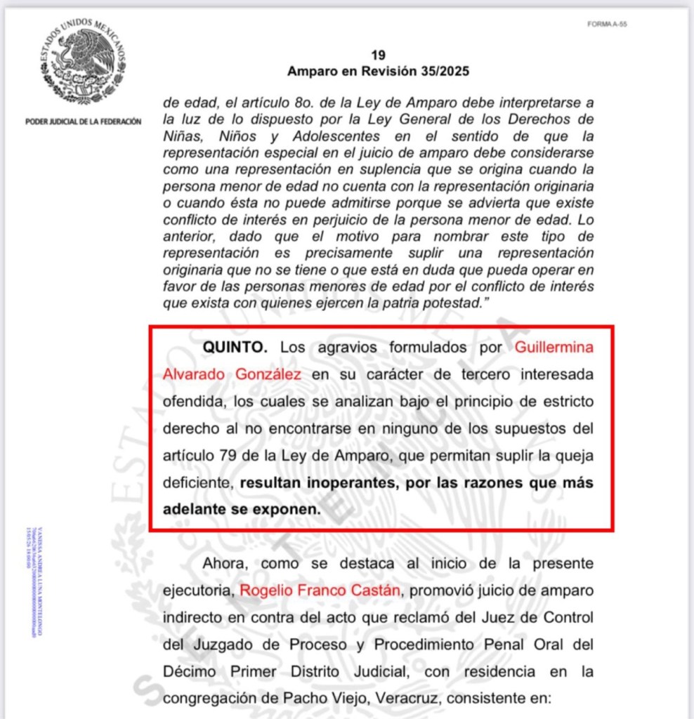 Dentro de los considerandos de la sentencia recaída al amparo en revisión, constan los razonamientos por los cuales se desecha el recurso de revisión interpuesto por la madre de la menor en calidad de tercera interesada, al considerar sus argumentos inoperantes y no encontrarse bajo ningún supuesto del articulo 79 de la ley de amparo, la resolución indica que el juez de control no estimó pruebas ofrecidas por la defensa de Rogelio Franco, se negó analizar constancias de un expediente civil, omitió revisar dictamen psicológico de su menor hija; contrario a lo que lo que se dijo, el tribunal no advirtió que Rogelio tuviera limitada guarda y custodia por alguna autoridad.