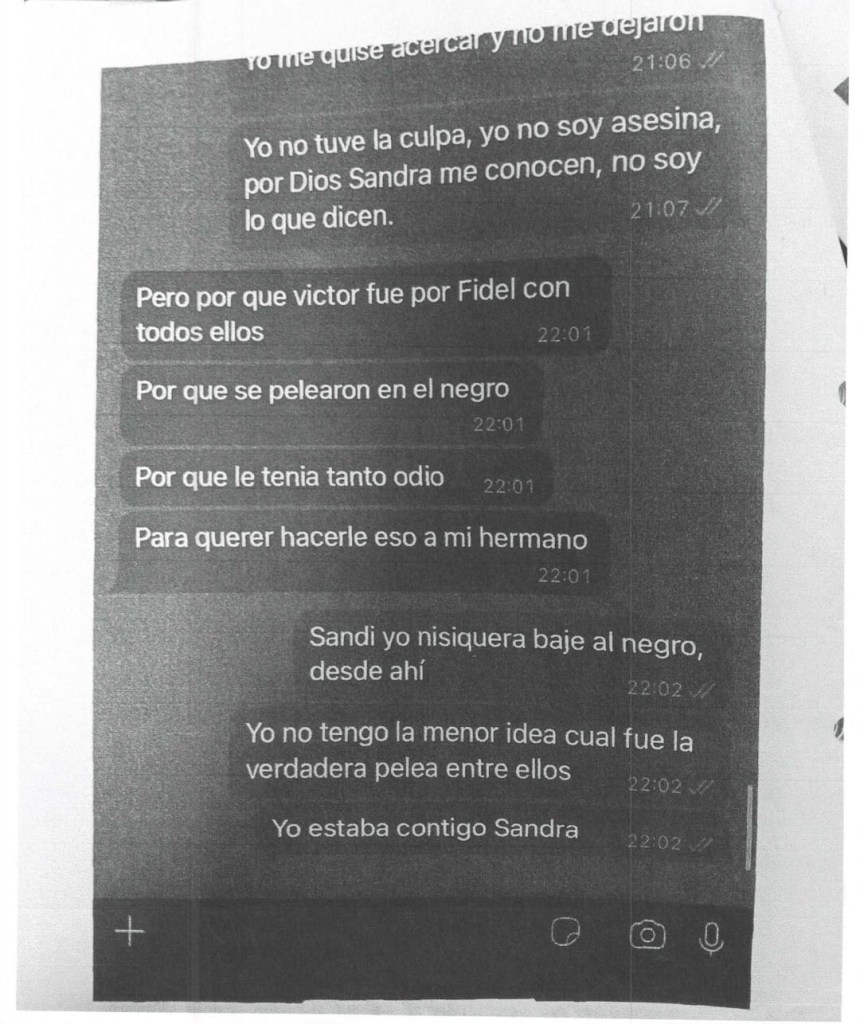 “Mi hija encuentra conversaciones ahí del joven que era coqueto, y mi hija pasa unas capturas a su celular, mi hija no traía batería, tan es asi, que Sandra le proporciona un cargador a mi hija, para que tuviera batería, y en lo que estaban revisando el teléfono, Sandra recibe una llamada de la madre, donde le dicen que habían matado a uno de sus hermanos, no sabía cuál de ellos, Michell en ese momento quedó muy sorprendida al escuchar esta versión, Sandra se dirige al domicilio de los hechos (de sus padres), mi hija detrás del ella, pero la madre no le permite estar ahí”.