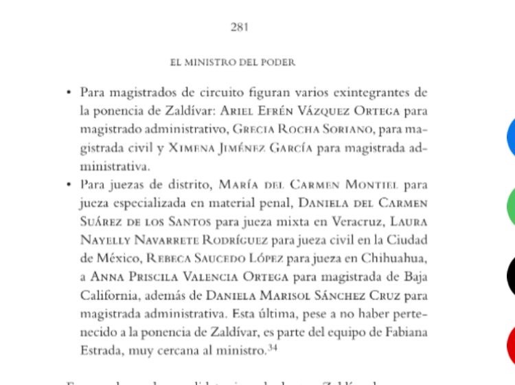 En el libro, Gómez afirma que la abogada y exdirectora general de Derechos Humanos de la Suprema Corte es parte del círculo cercano de Zaldívar, quien supuestamente la habría propuesto personalmente como candidata a jueza de distrito en materia mixta en Veracruz.