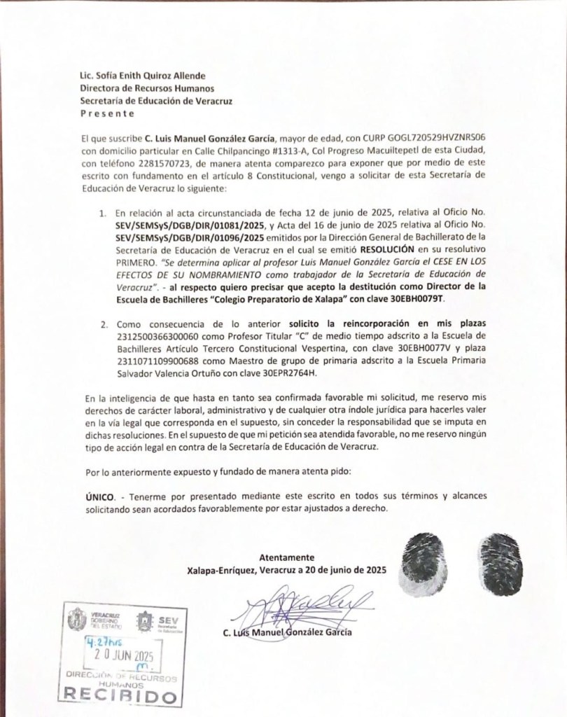 En una misiva enviada a Sofía Enith Quiroz Allende, directora de Recursos Humanos de la institución educativa, el profesor aceptó el pasado viernes 20 de junio de 2025 “la destitución como Director de la Escuela de Bachilleres ‘Colegio Preparatorio de Xalapa’ con clave 30EBH0079t”.