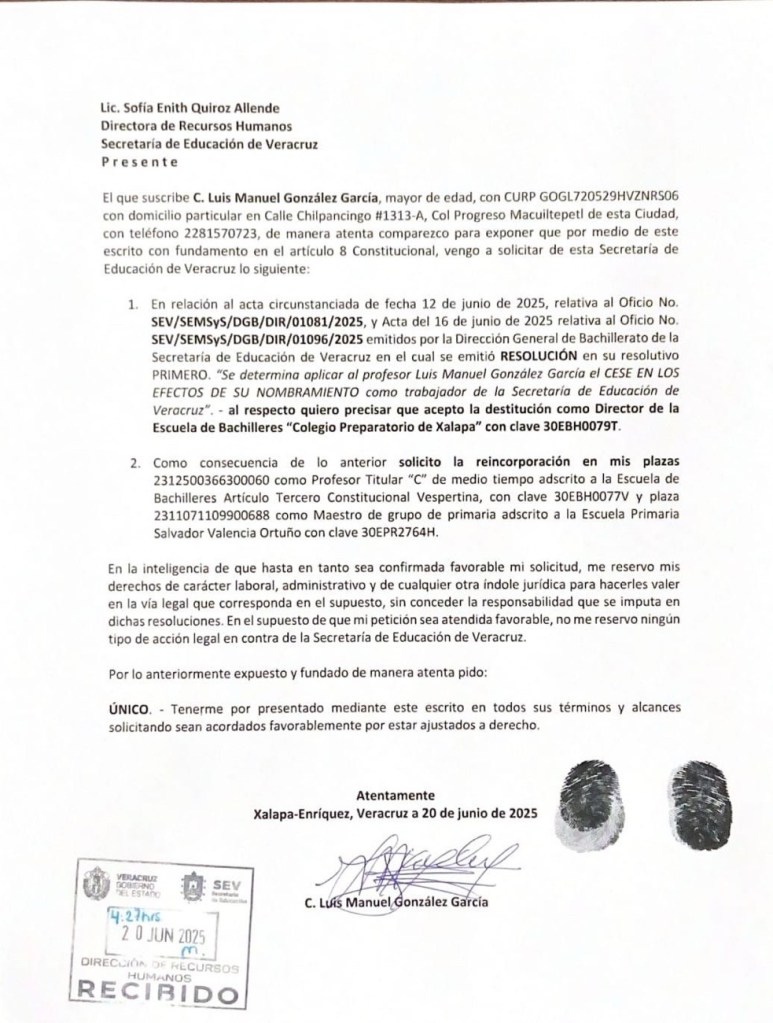 En una misiva enviada a Sofía Enith Quiroz Allende, directora de Recursos Humanos de la institución educativa, el profesor aceptó el pasado viernes 20 de junio de 2025 “la destitución como Director de la Escuela de Bachilleres ‘Colegio Preparatorio de Xalapa’ con clave 30EBH0079t”.