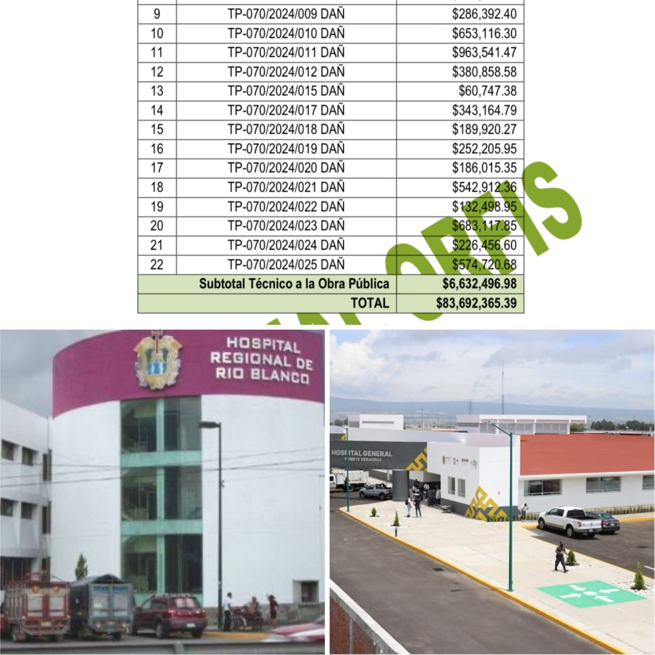 -Rehabilitación de Río Blanco: Se observó un presunto daño patrimonial de $228,730.92 debido a pagos en exceso por volúmenes no ejecutados y deficiencias técnicas en la obra del Hospital de Río Blanco. El monto pagado fue de $7,112,419.59, mientras que el monto contratado fue de $14,994,375.64.