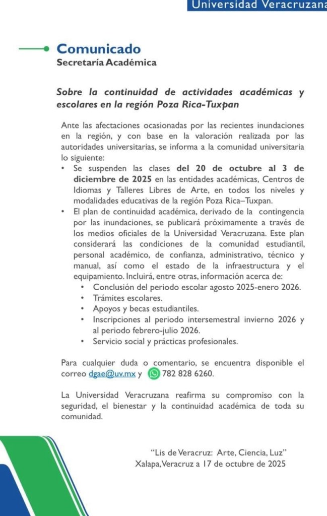 Activa la UV el Plan académico emergente, en los próximos días informarán cómo se dará continuidad a las clases de este semestre agosto 2025- enero 2026.
